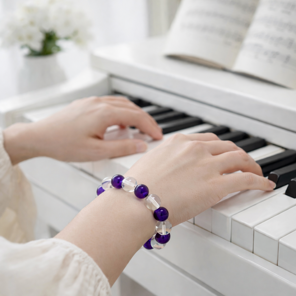 Amethyst is believed to promote calmness, spiritual insight, and inner wisdom, helping relieve stress and encourage clarity of thought. Clear Quartz is known as an energy amplifier, supporting balance, cleansing negative energy, and strengthening personal intentions. Together, their harmonious vibrations are thought to encourage chakra alignment, mental focus, and a smooth flow of energy throughout the body.