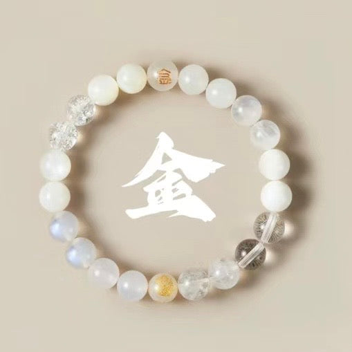Inspired by the ancient philosophy of Wuxing (Five Elements), the Metal Element Bracelet symbolizes clarity, discipline, strength, and refinement. Crafted with luminous white and translucent crystals, this bracelet reflects the pure, focused, and balanced energy associated with the Metal element.