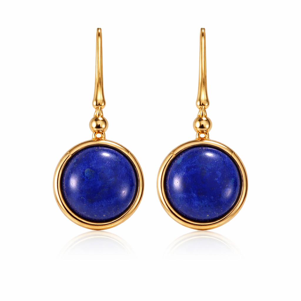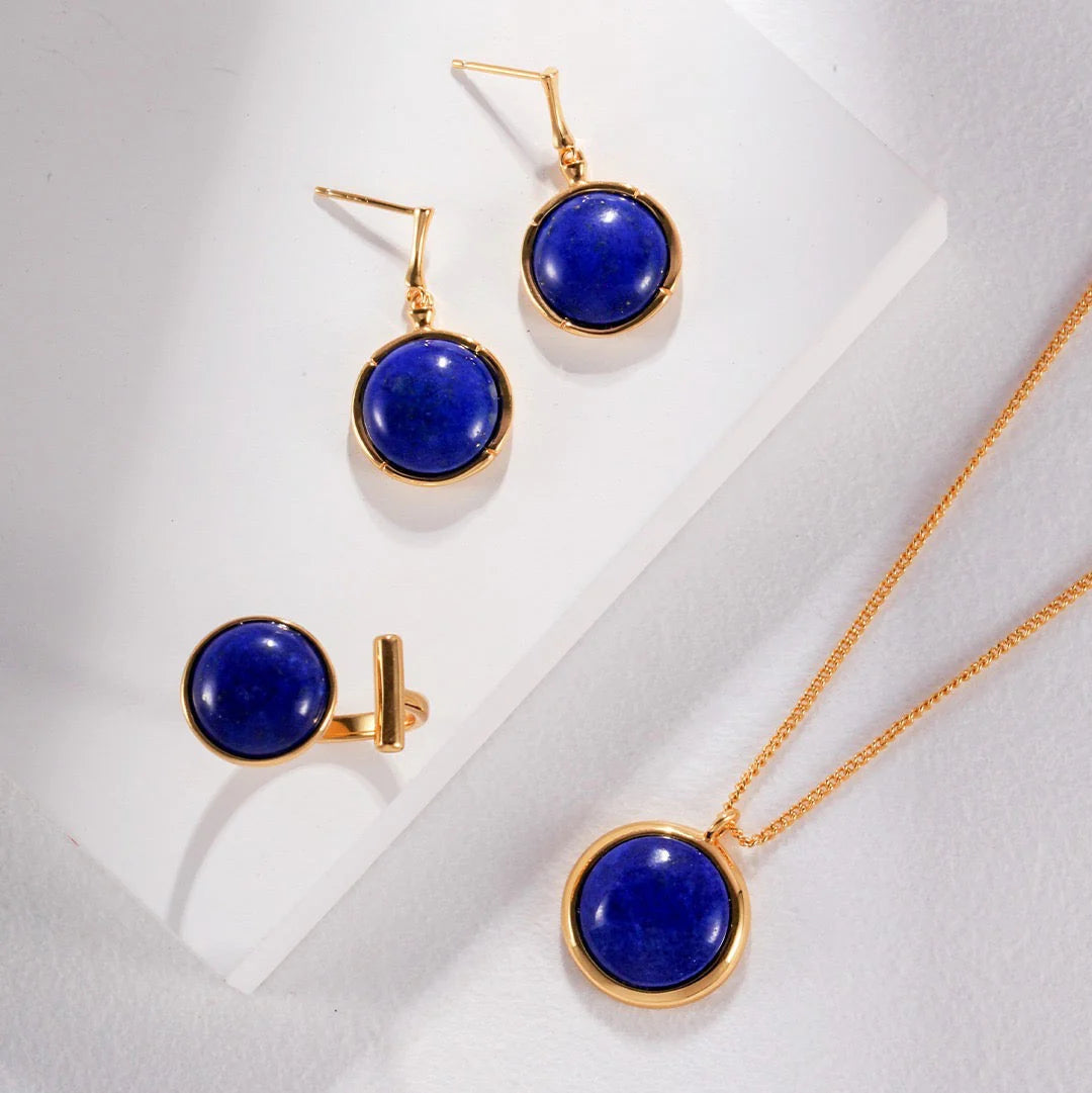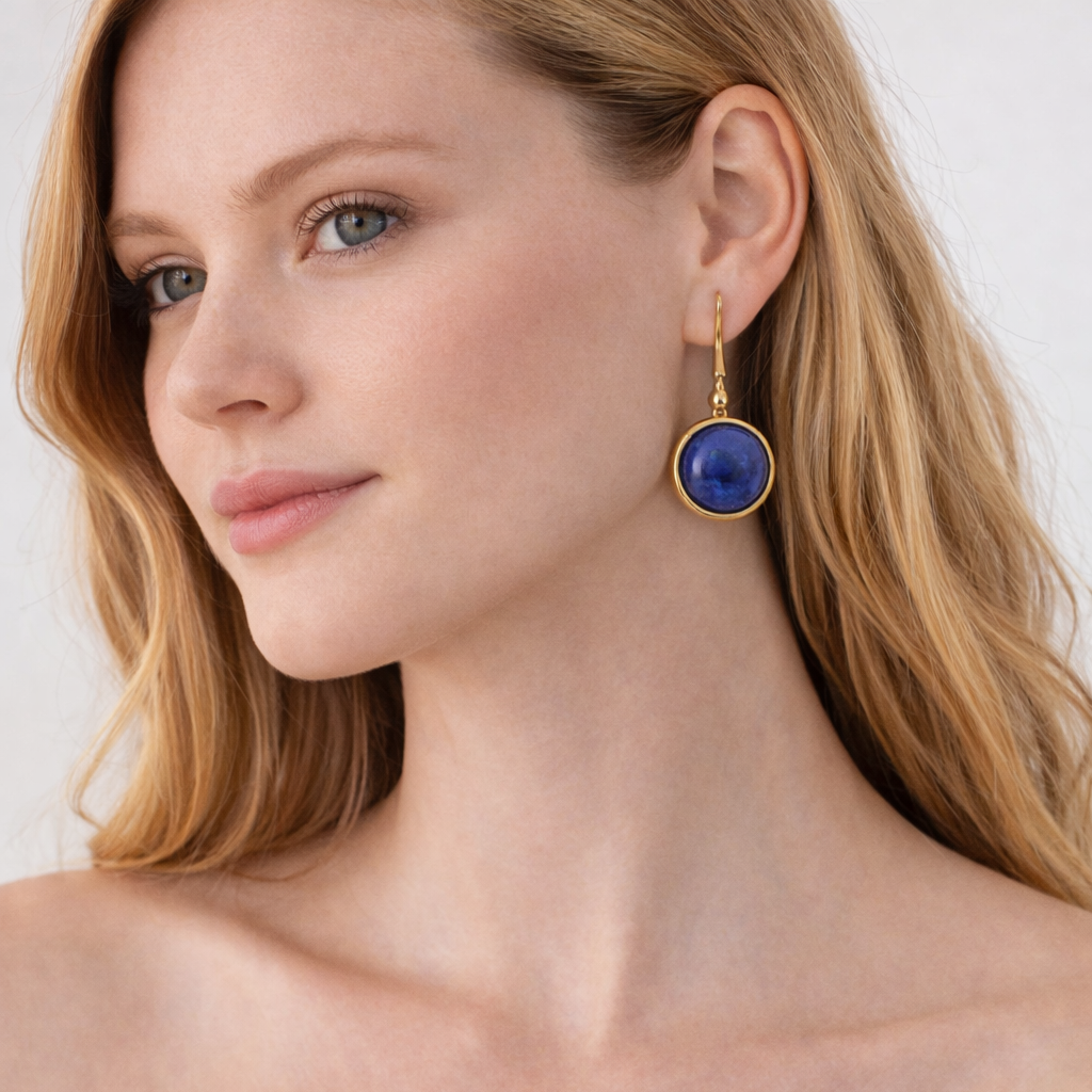 Inspired by the depth and mystery of the night sky, the Azure Galaxy Earrings feature luminous natural lapis lazuli stones in a rich, celestial blue. Each stone is carefully polished and framed in gold plated sterling silver, creating a refined contrast that highlights the beauty of the gemstone.