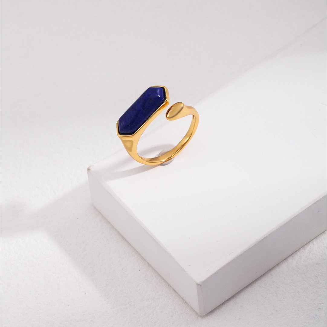 The Azure Galaxy Open Ring features a sleek lapis lazuli stone with deep blue tones and subtle natural speckles, evoking the beauty of a starry night sky. Set in gold-plated sterling silver, the open-ring design offers both modern elegance and comfortable wear.