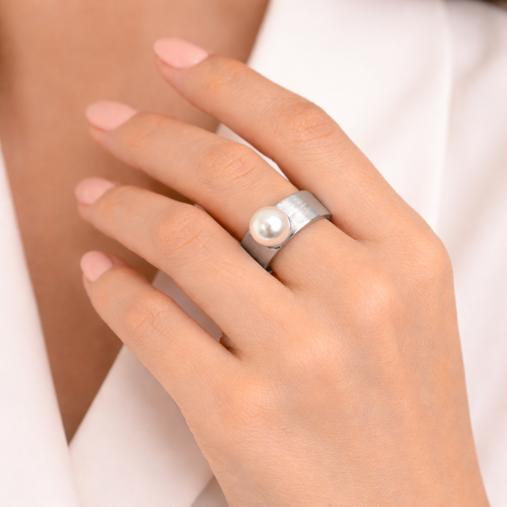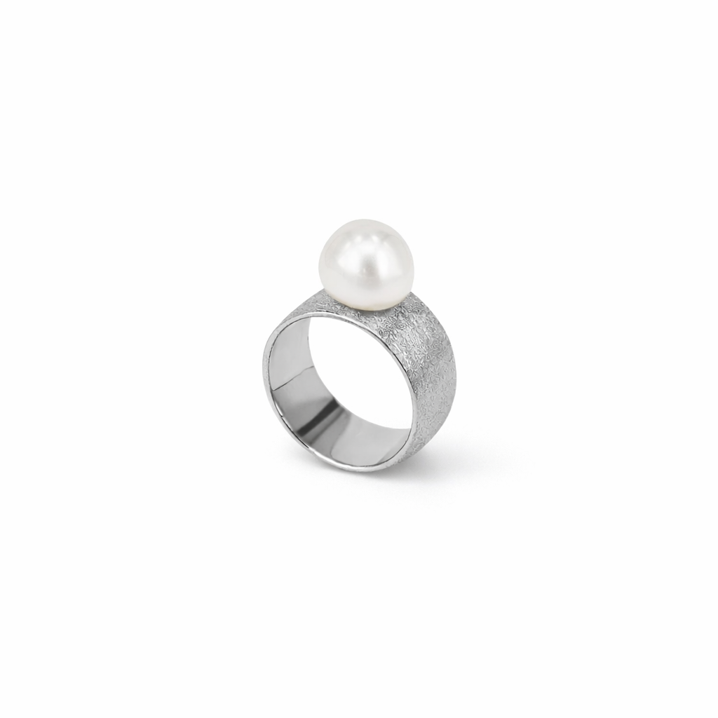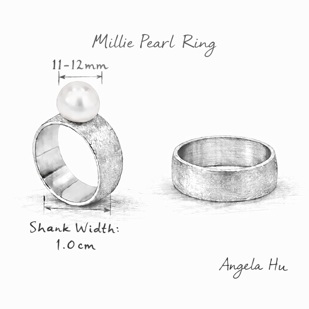 The Millie Pearl Ring features a luminous freshwater pearl set on a bold, textured sterling silver band. The contrast between the organic pearl and the softly brushed metal creates a refined yet contemporary look — perfect for everyday wear or effortless styling.