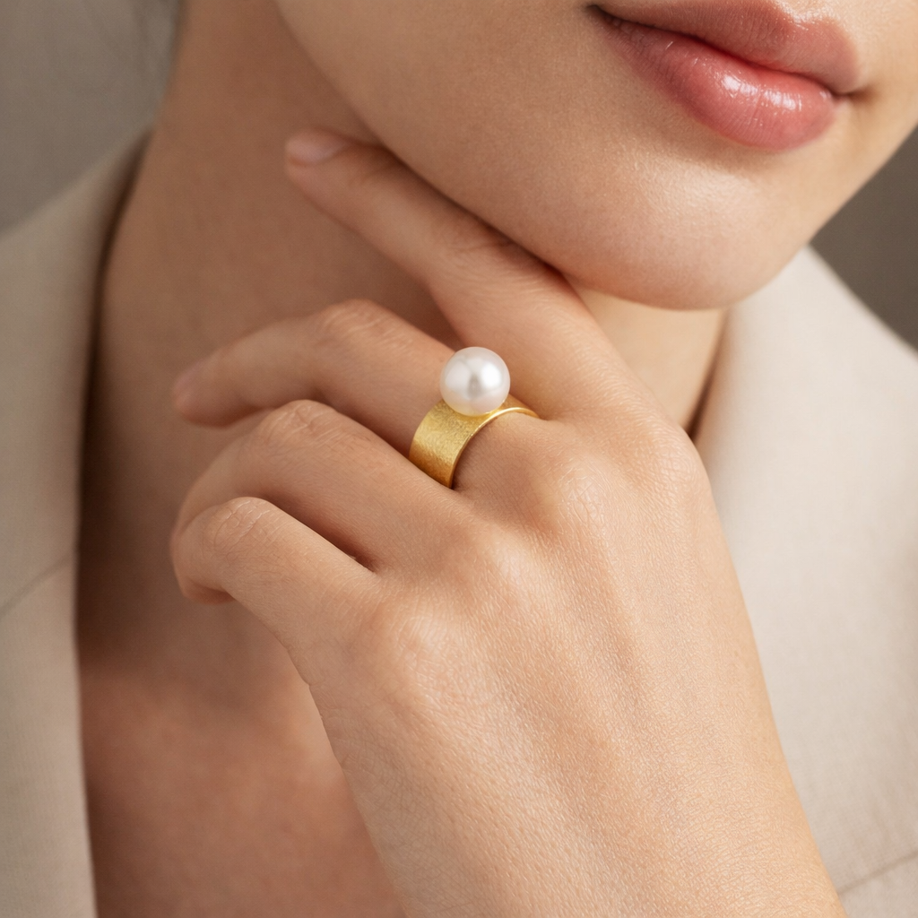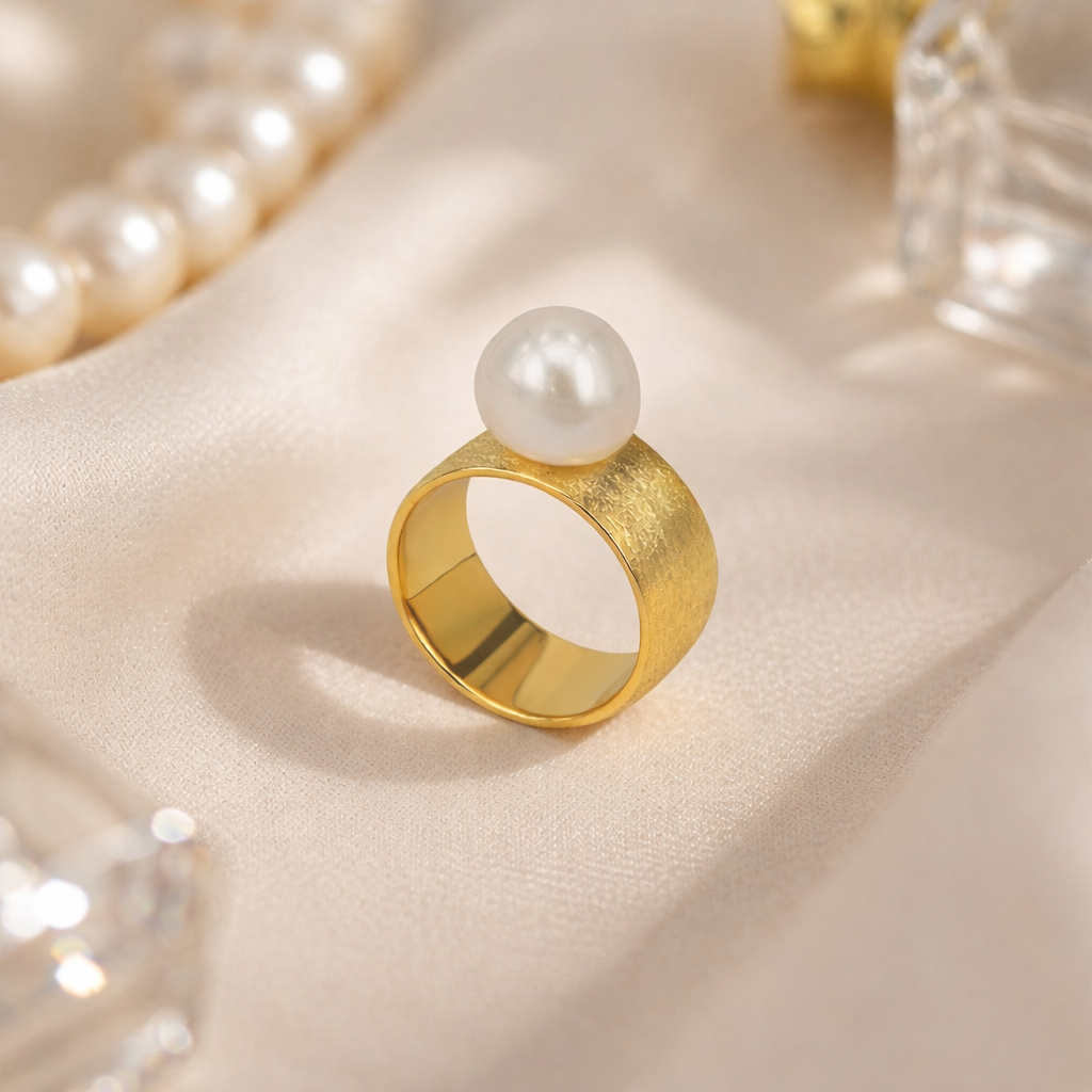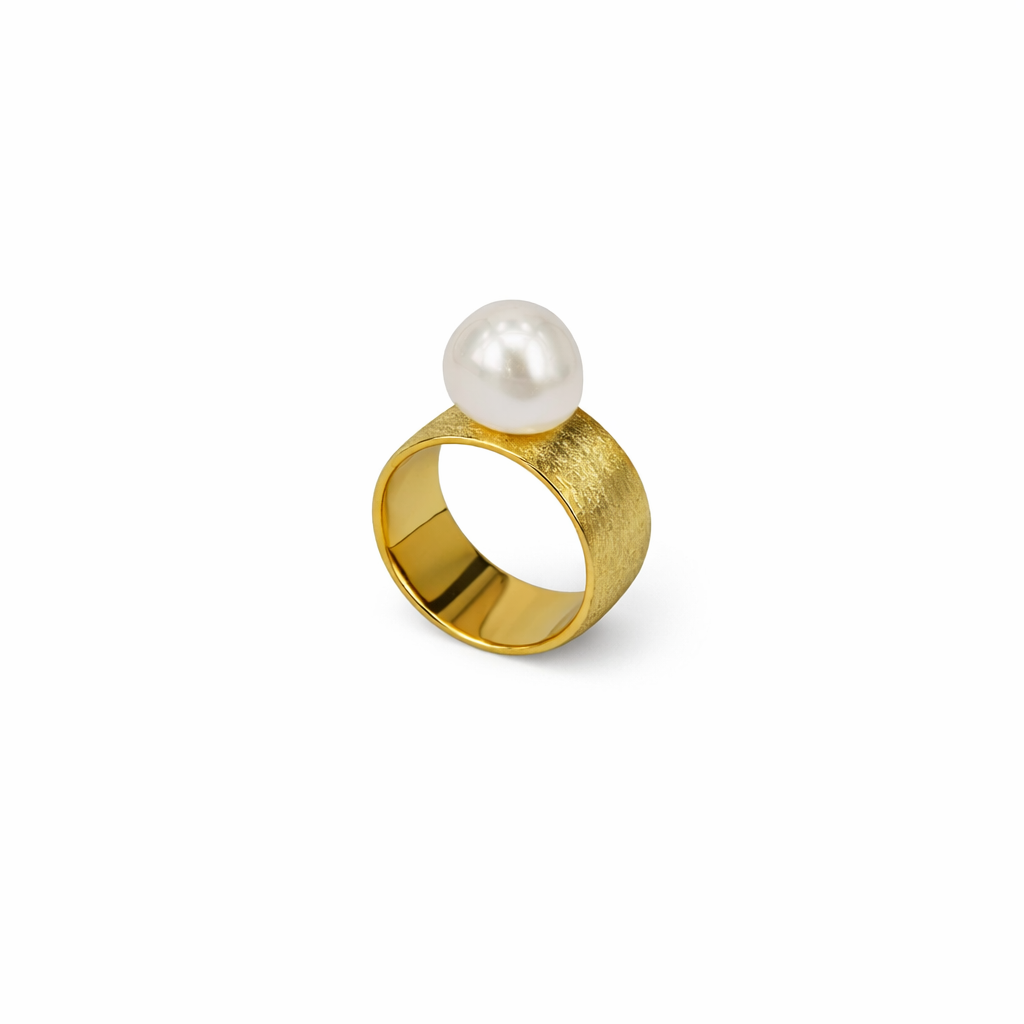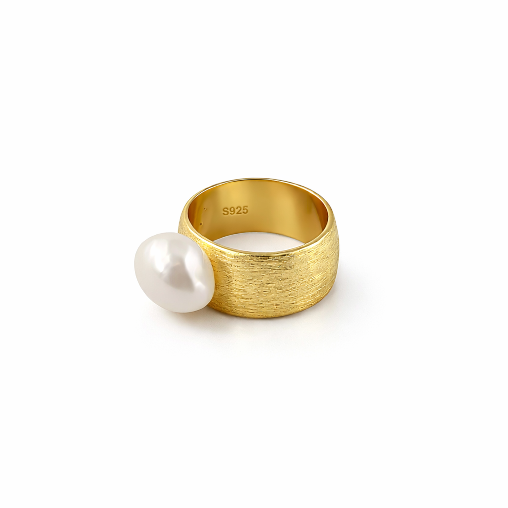 The Millie Pearl Ring features a luminous freshwater pearl set on a bold, textured sterling silver band. The contrast between the organic pearl and the softly brushed metal creates a refined yet contemporary look — perfect for everyday wear or effortless styling.
