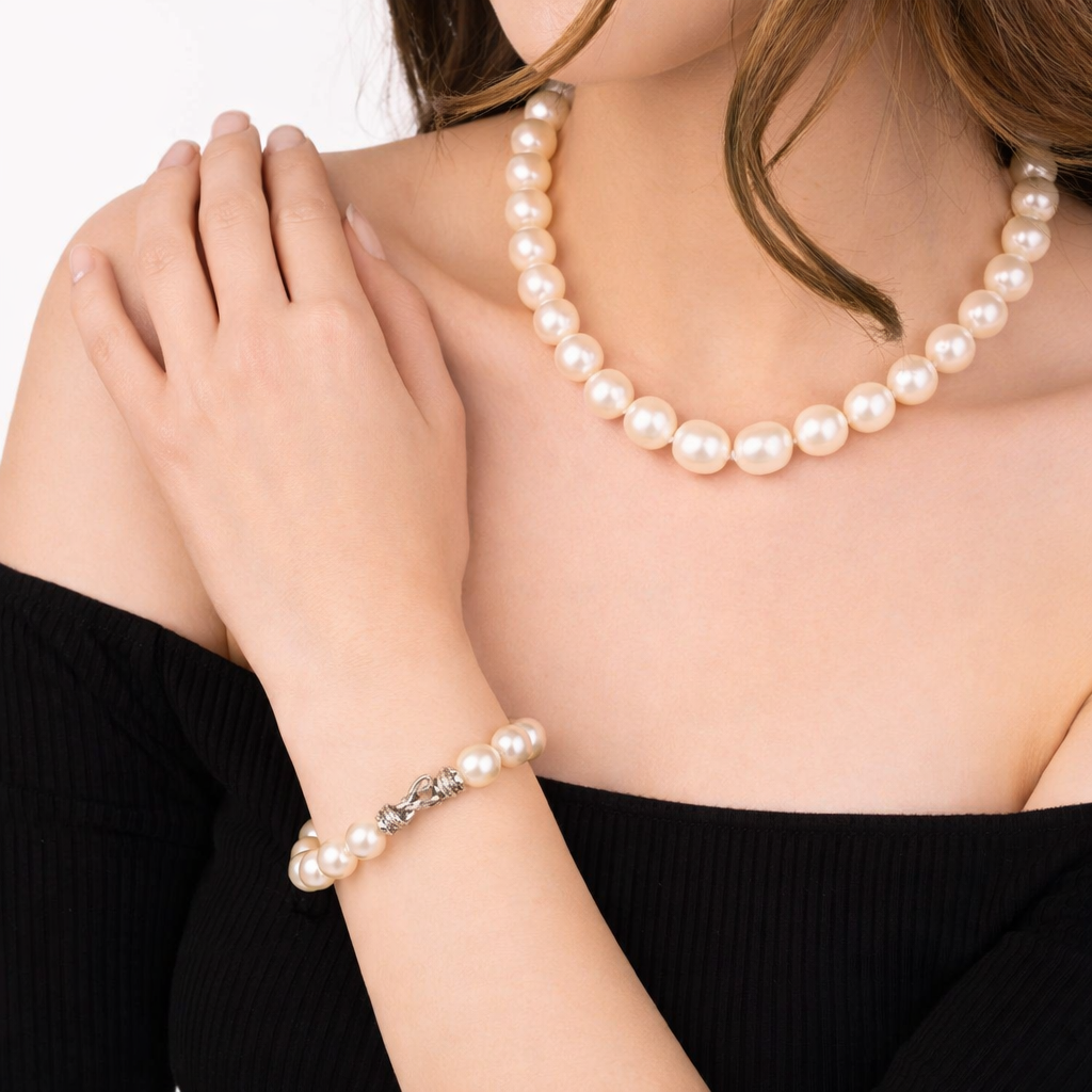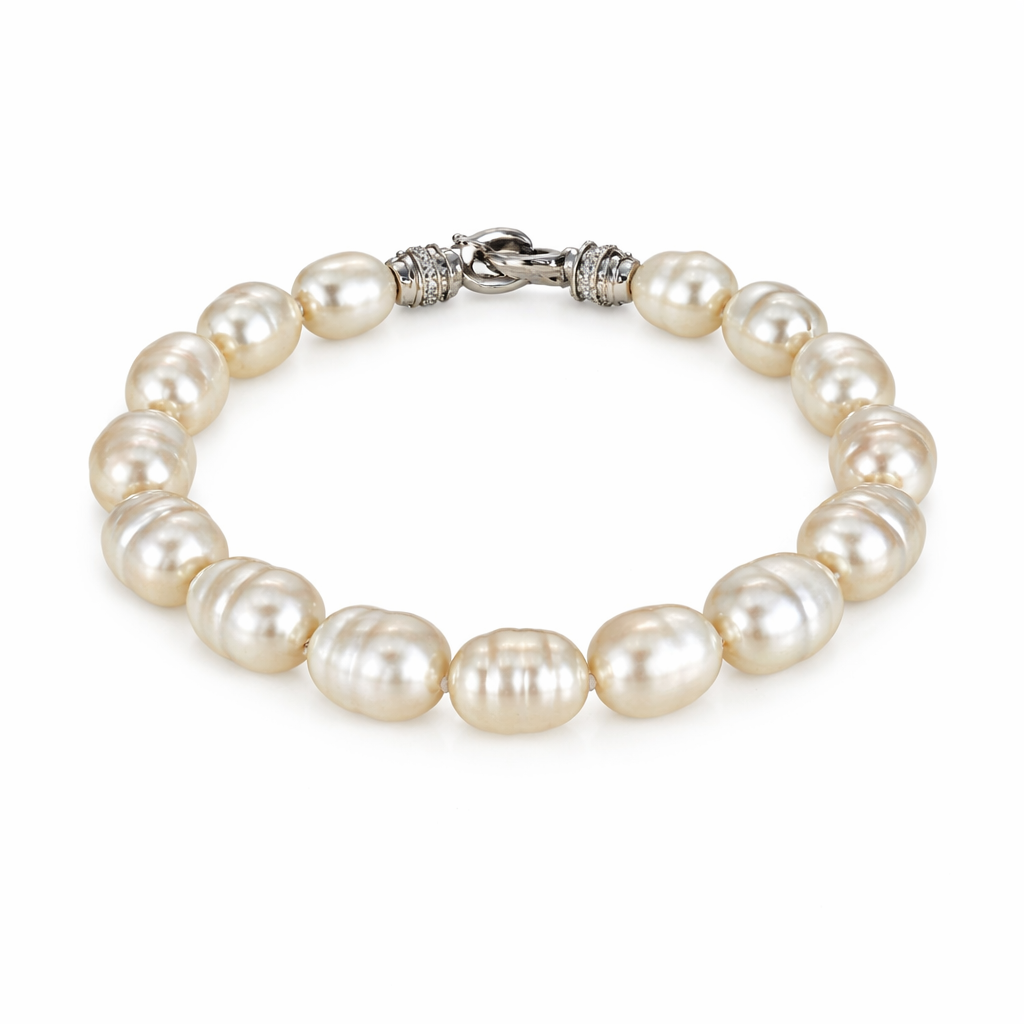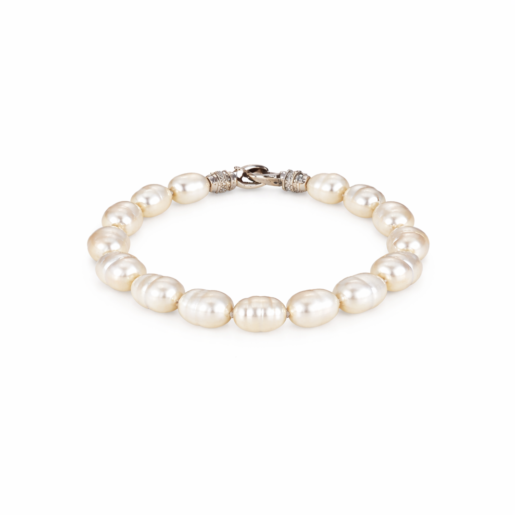 A refined statement of modern elegance, this bracelet features luminous freshwater spiral baroque pearls, each measuring 9–10 mm, offering rich texture and natural character in every piece.