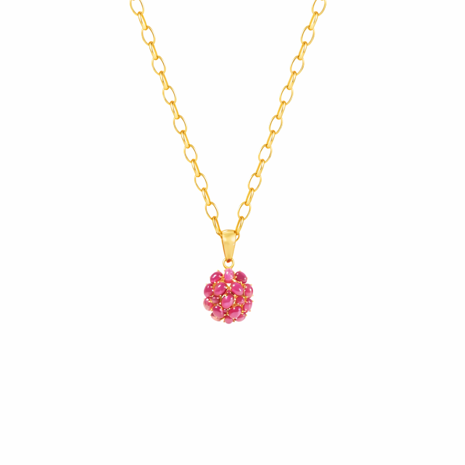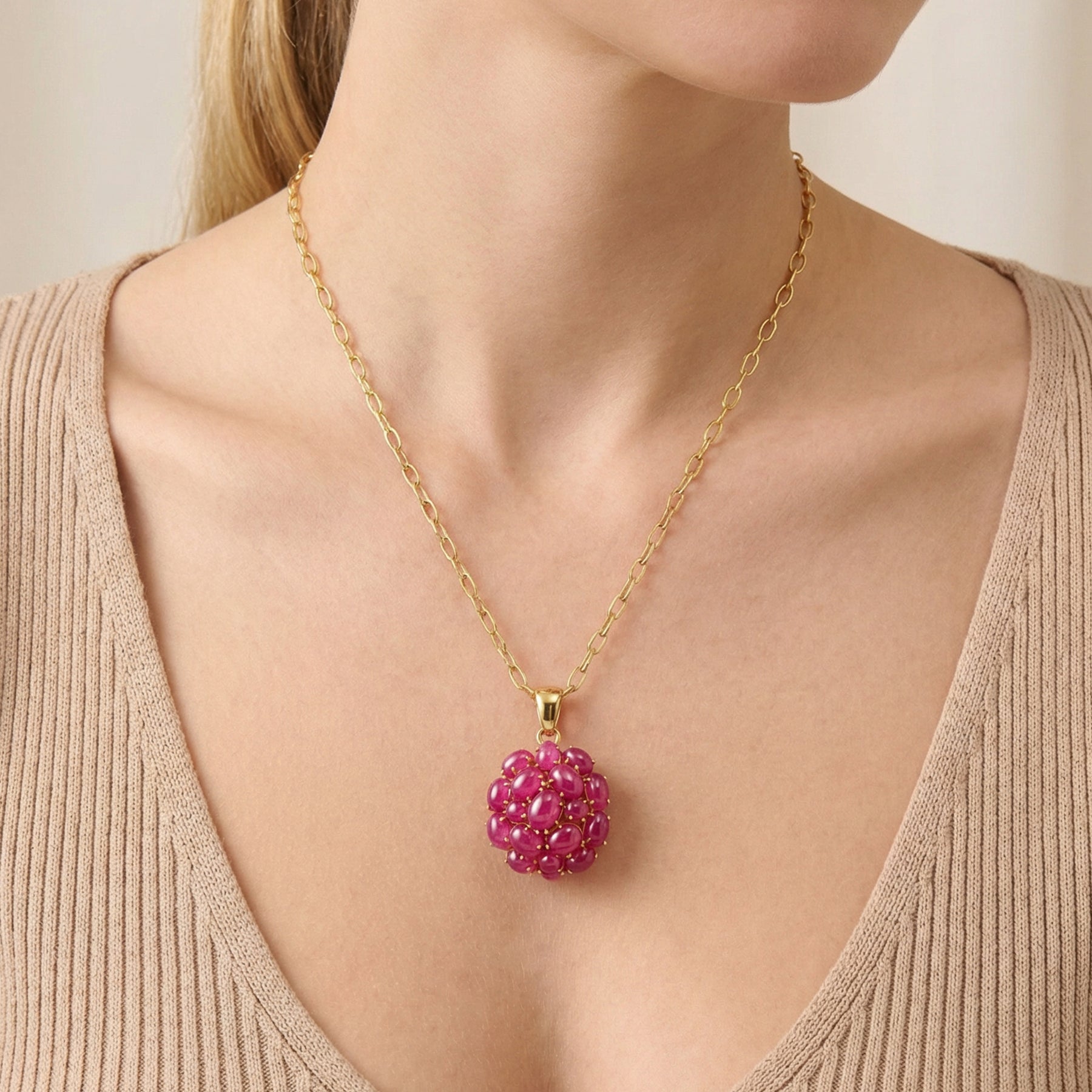This elegant pendant features 17 natural cabochon rubies, showcasing a rich blue tone and smooth, luminous finish. Crafted in gold-plated sterling silver, the clustered design creates a refined statement with timeless appeal.