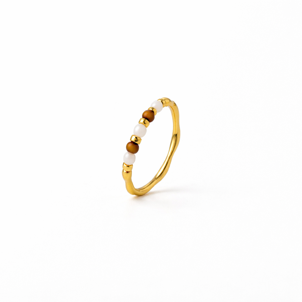 A delicate ring featuring the warm, grounding tones of Tiger Eye paired with the soft iridescence of Mother of Pearl. The contrast of natural stones creates a balanced, elegant look—both modern and timeless.