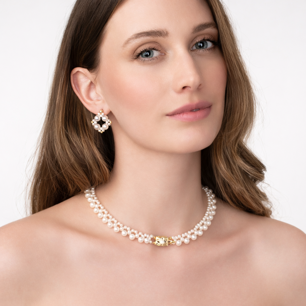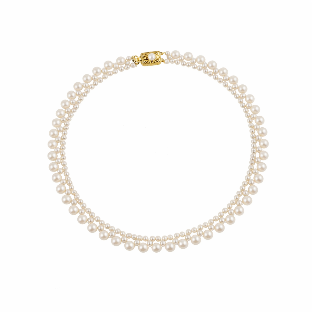 A refined double-strand freshwater pearl necklace featuring a Victorian-inspired gold-plated sterling silver clasp. The elegant pearl graduation from 4–6.5mm creates a timeless silhouette, blending vintage charm with modern sophistication.