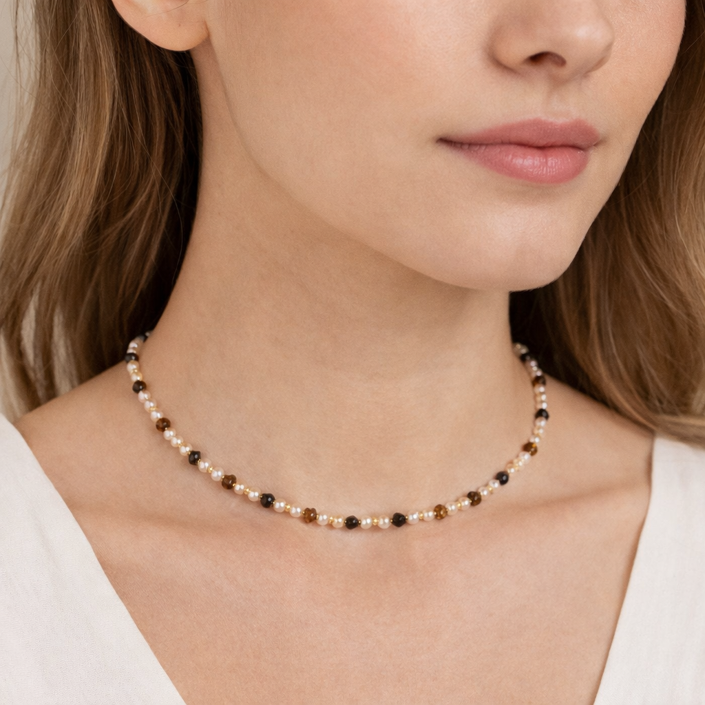 Elegant flattened gemstone beads accented with delicate gold spacers. Crafted in Tiger Eye, Mother of Pearl, and Black Agate, finished with gold-plated 925 sterling silver.