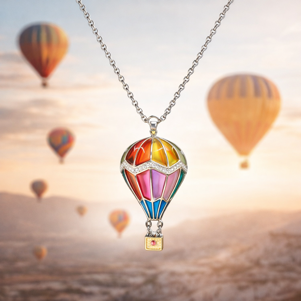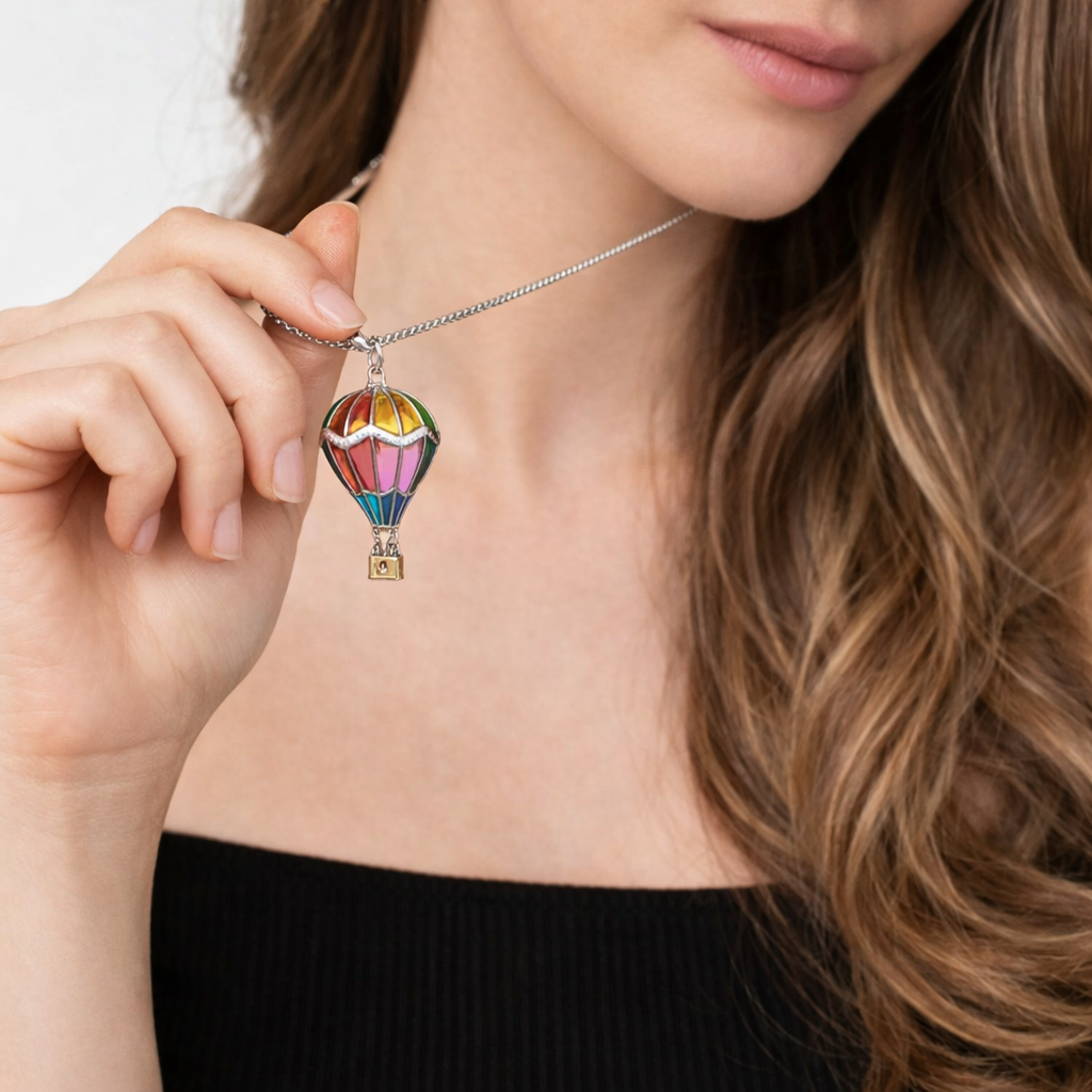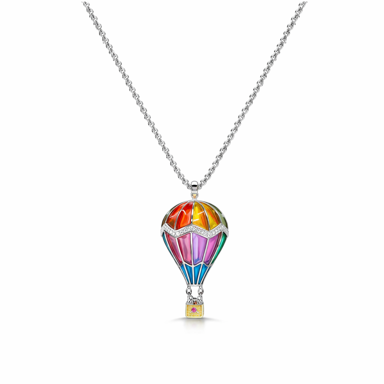 This beautifully crafted hot air balloon pendant captures the spirit of freedom and adventure, brought to life through vibrant multicolour enamel and sparkling Swarovski crystals.