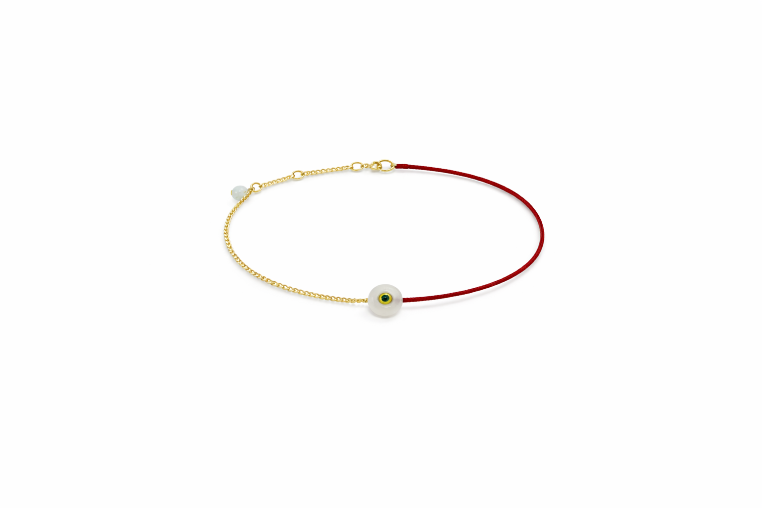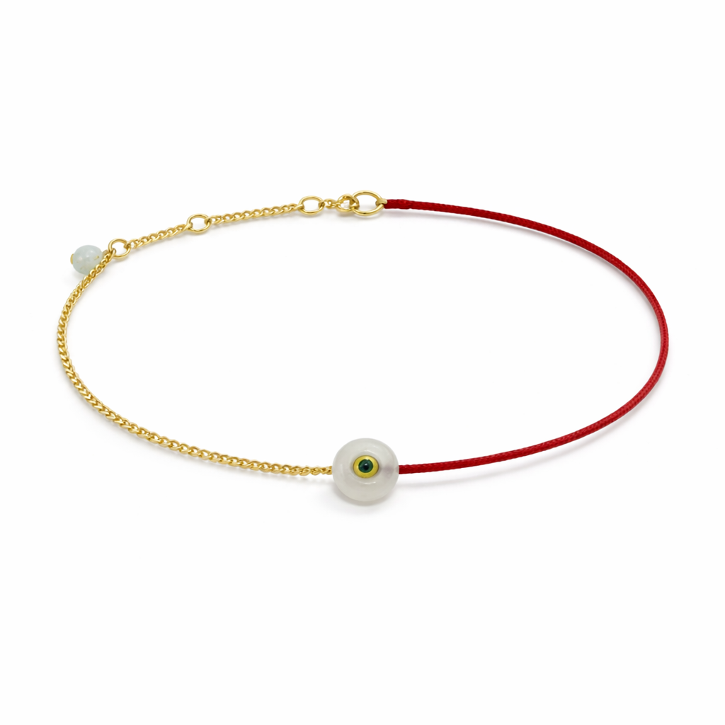Featuring a luminous white jade harmony knot with a tiny Tsavorite gemstone center, crafted in 18K gold (weight 1.06g) and traditional Chinese wax cord. Adjustable fit for everyday grace and meaningful wear.